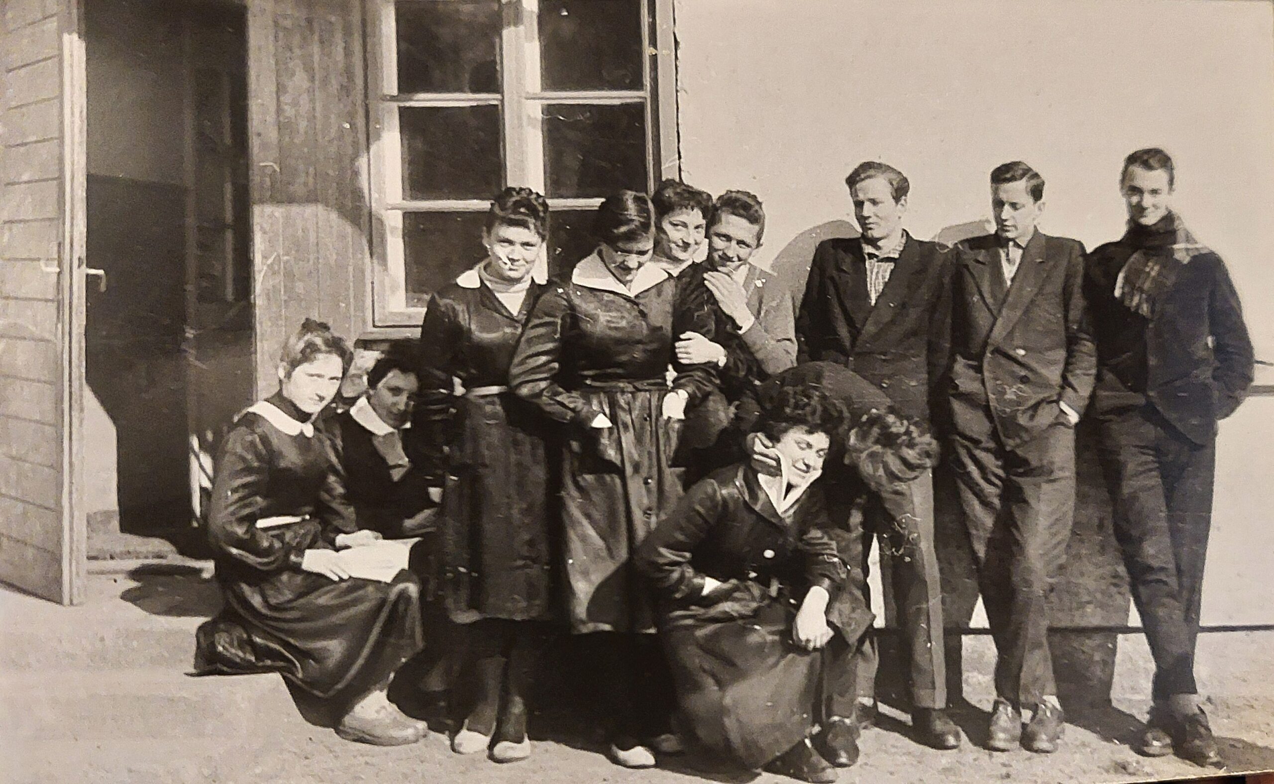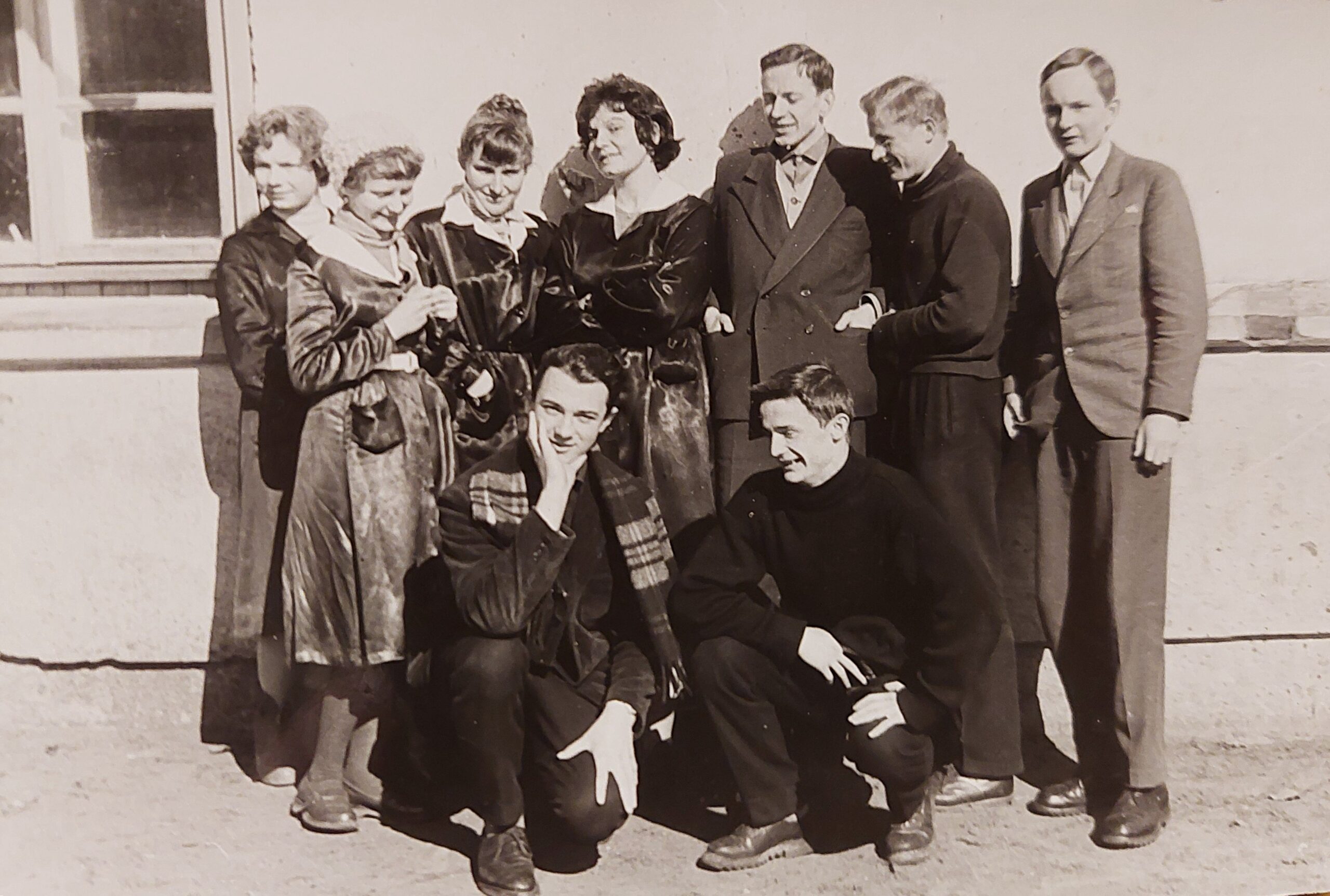 Klasa maturalna LO w Sulejówku przed tzw. barakiem. Od lewej kucają: Andrzej Ochalski i Jerzy Niecikowski, od prawej stoją: Makarewicz, Wójcik i Bogusław Borowiecki