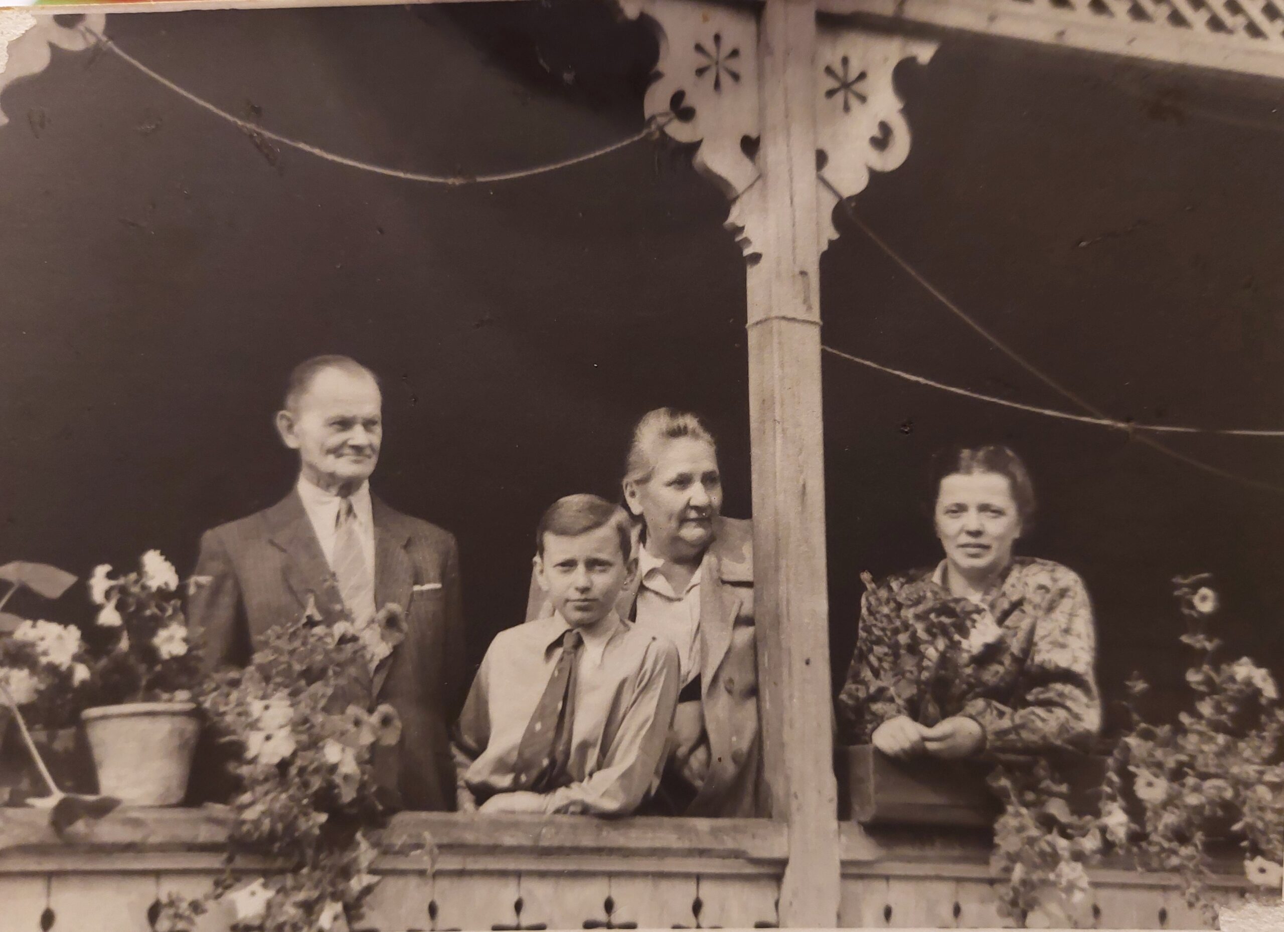 Edward Stelmaszyński, Bogusław Borowiecki, Leokadia Stelmaszyńska i Jadwiga Borowiecka na werandzie domu Cholewów przy ul. Reymonta 43