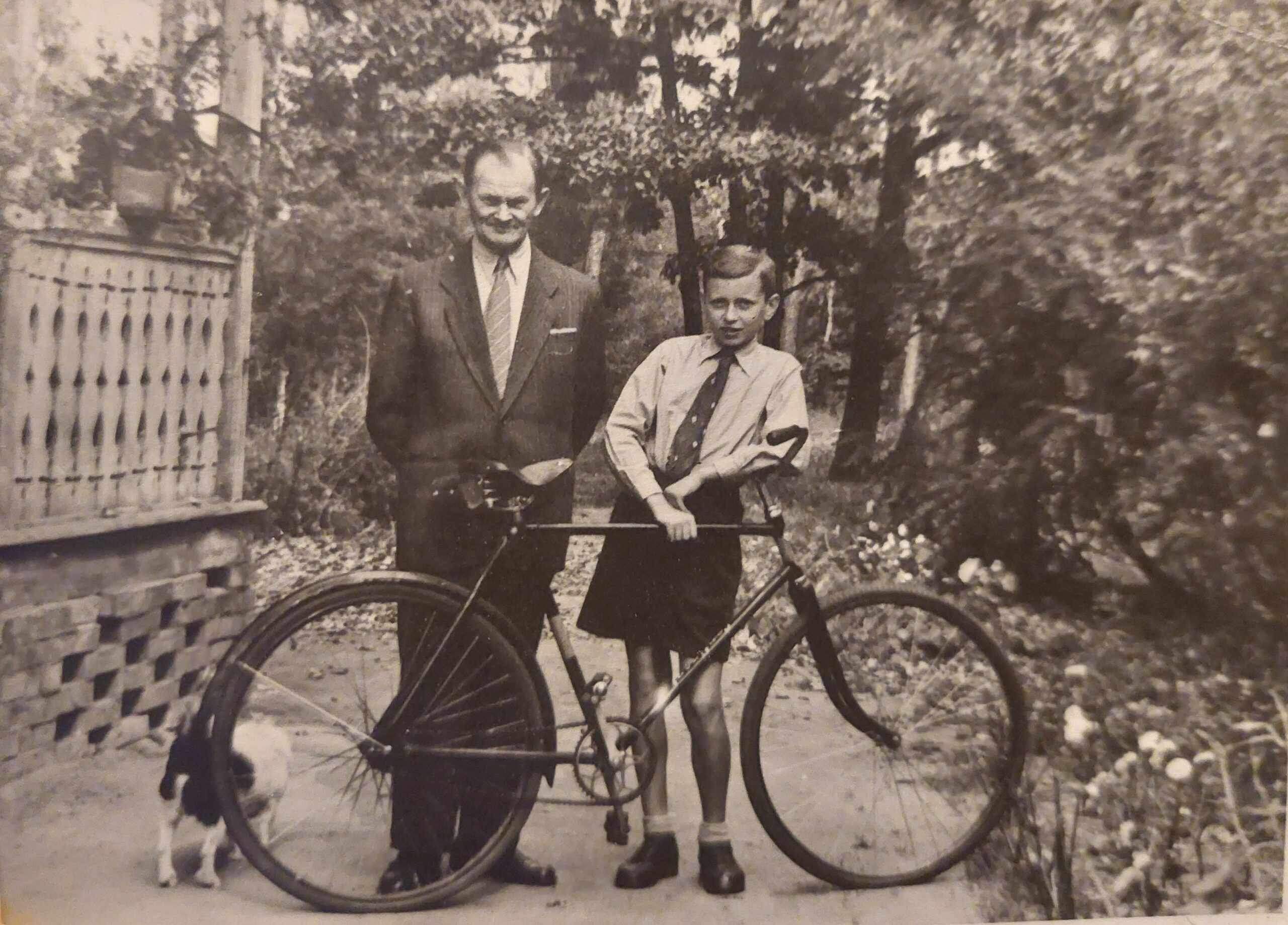Bogusław Borowiecki z dziadkiem Edwardem Stelmaszyńskim przed domem Cholewów przy ul. Reymonta 43 w Sulejówku