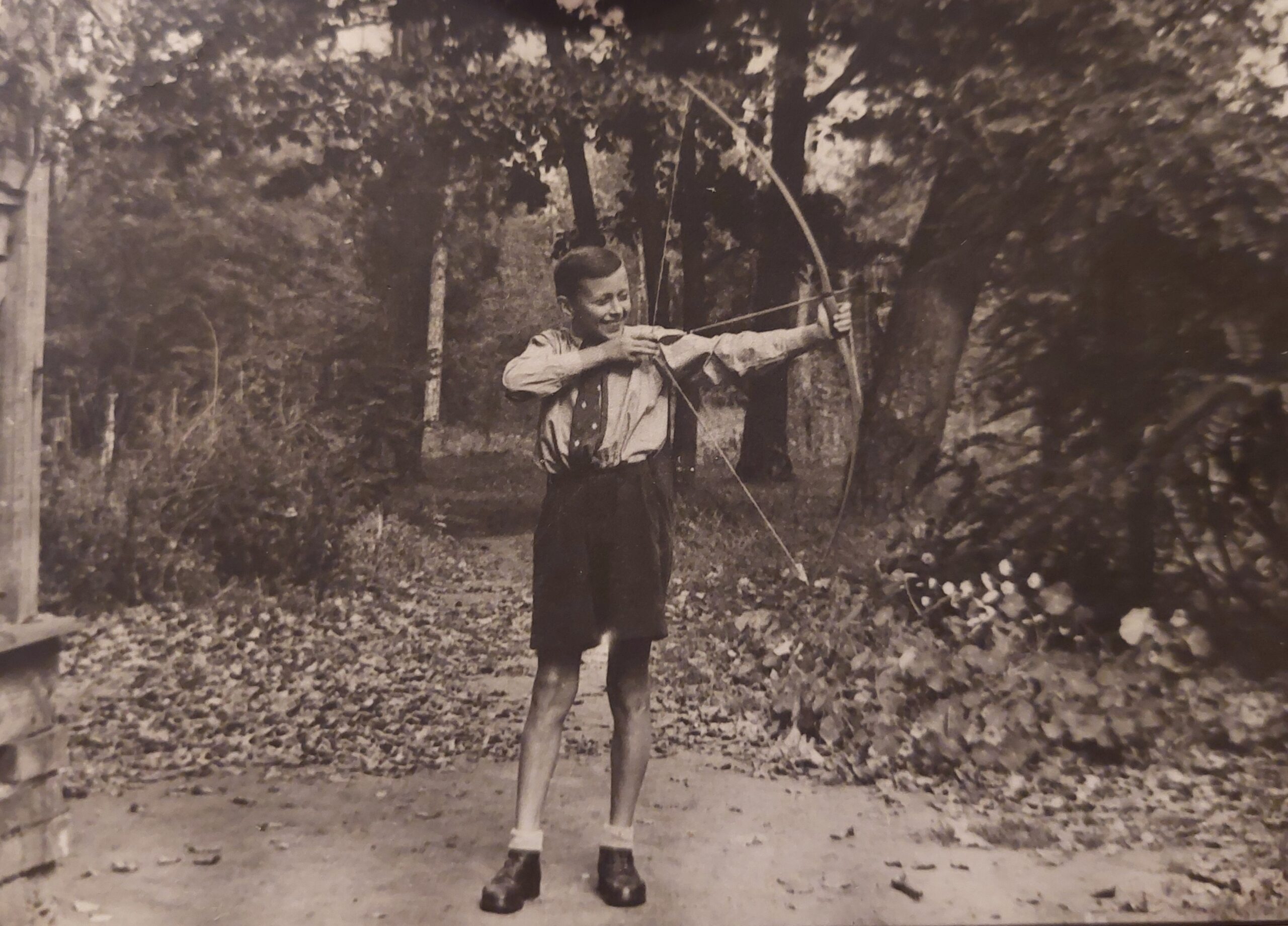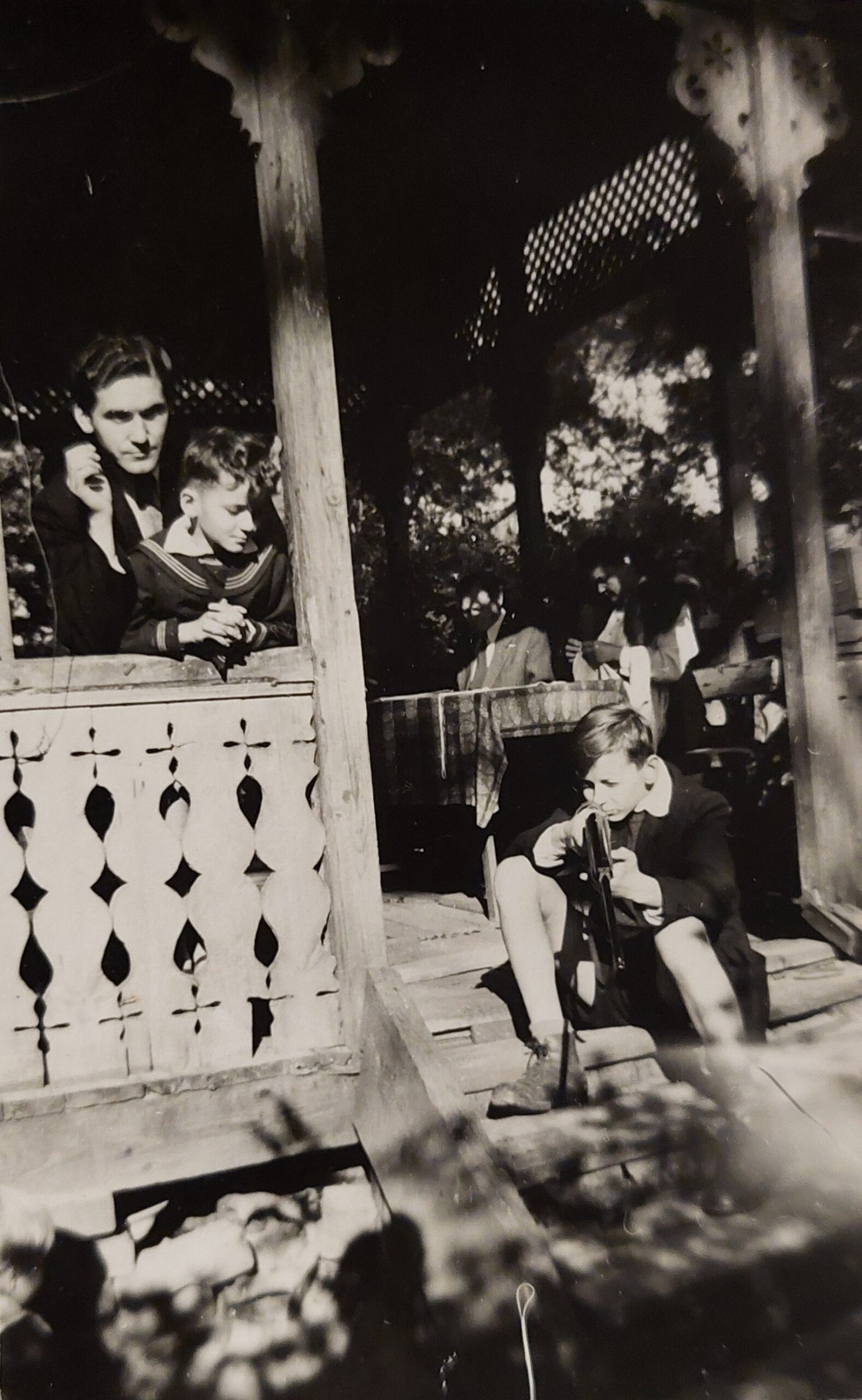Bogusław Borowiecki z wiatrówką na werandzie domu Cholewów przy ul. Reymonta 43 w Sulejówku